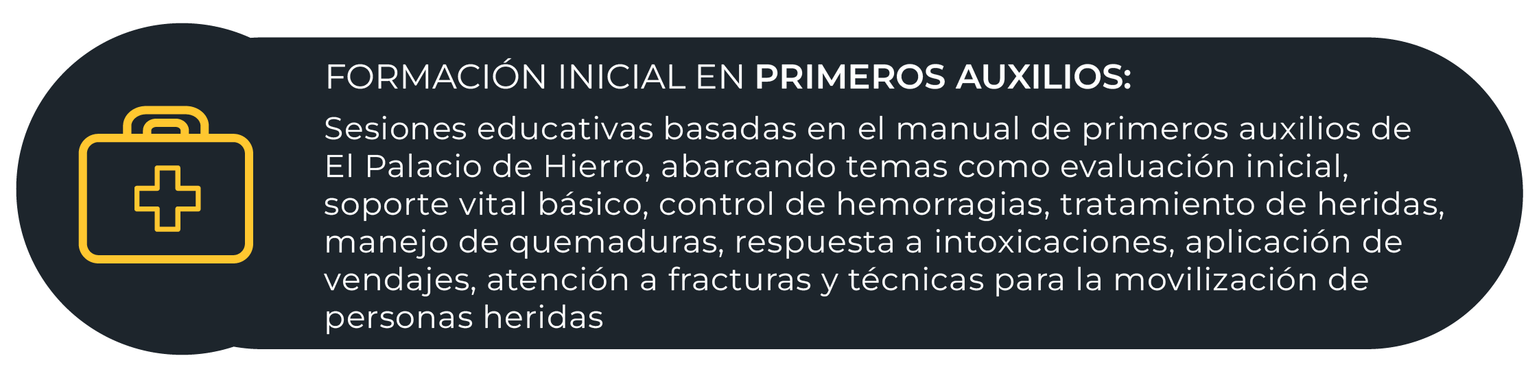 Además, ofrecimos formación periódica, cada dos meses y de forma anual, a los miembros del equipo encargados de la brigada de primeros auxilios, sobre temas tales como: