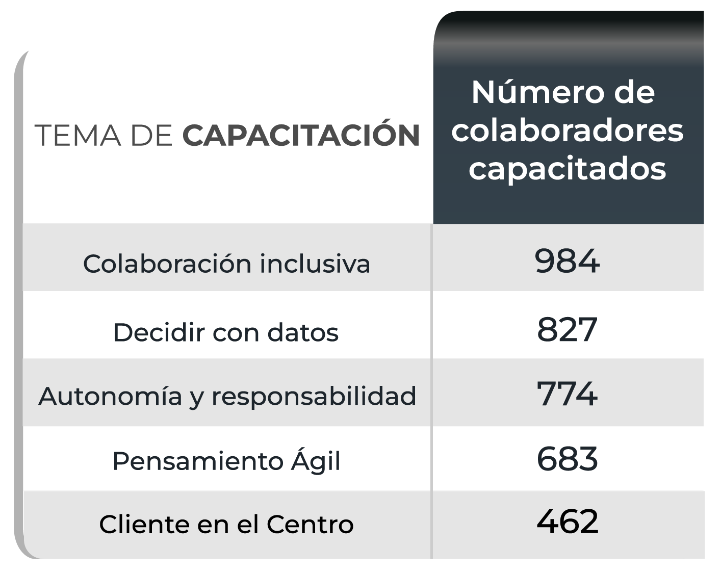 Asimismo, en el año 2022, se desarrolló el modelo de Academias de Formación en Datos y Agilidad, con la finalidad de capacitar a los colaboradores en metodologías de trabajo ágiles y orientar a la organización hacia una cultura basada en el análisis de datos.